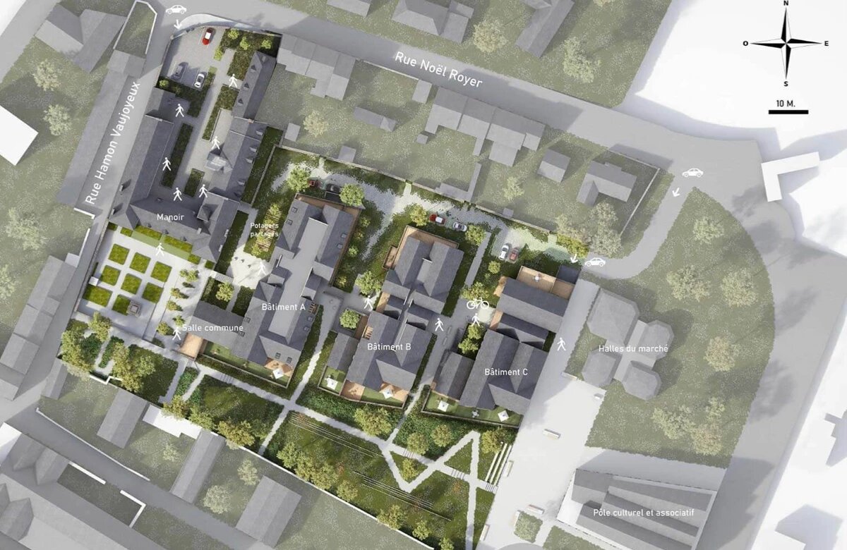 Le programme intègre des espaces partagés tels qu'un jardin potager, une salle commune et une halle de marché, renforçant le lien social entre les résidents. 🤝