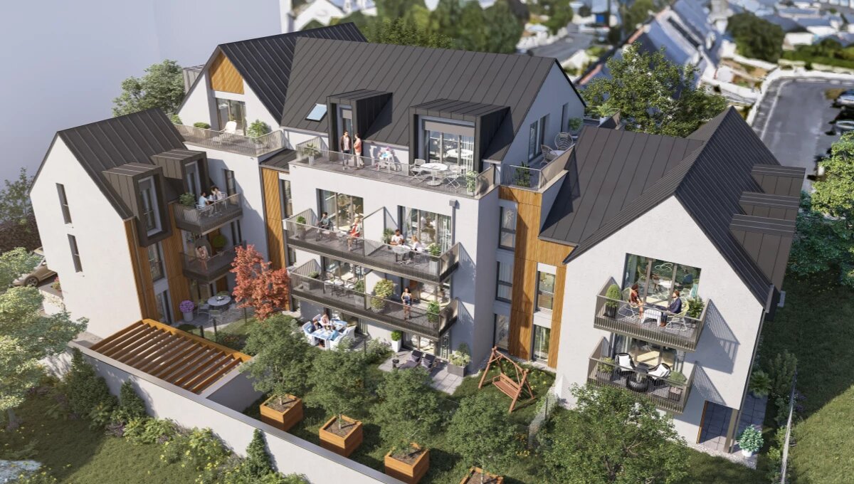 Située sur les hauteurs de Bellevue, dans un quartier résidentiel calme de Saint-Malo, la résidence Agapanthe offre un cadre de vie paisible et verdoyant. Ce programme neuf, développé par Pierre Promotion et conçu par l'agence d'architecture PAA Paumier Associés Architecture, s'intègre harmonieusement dans l'environnement malouin grâce à une architecture moderne et chaleureuse.