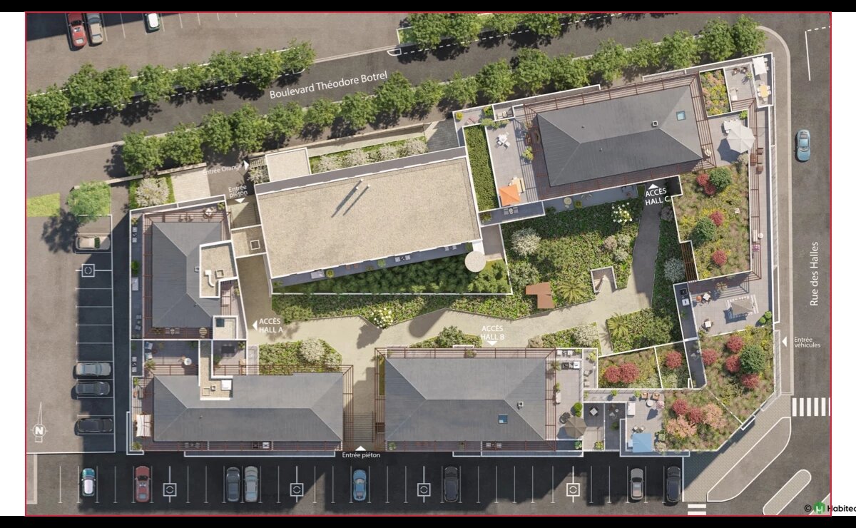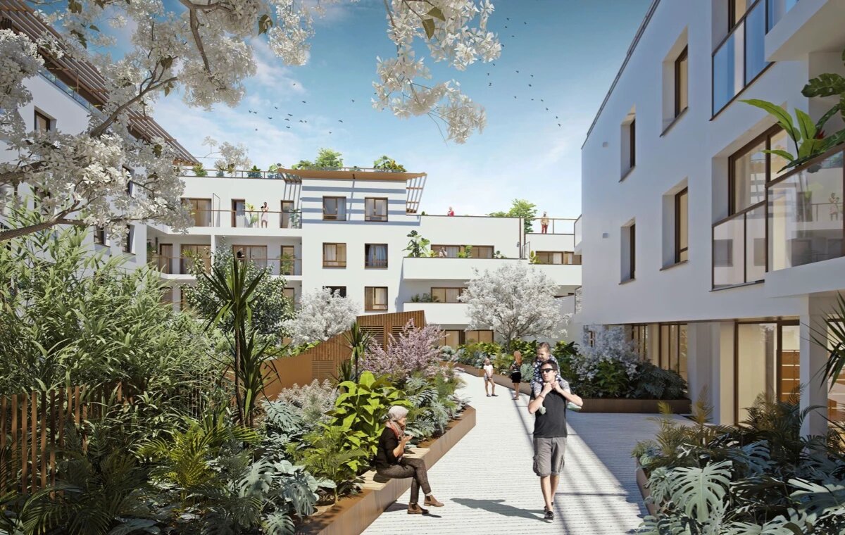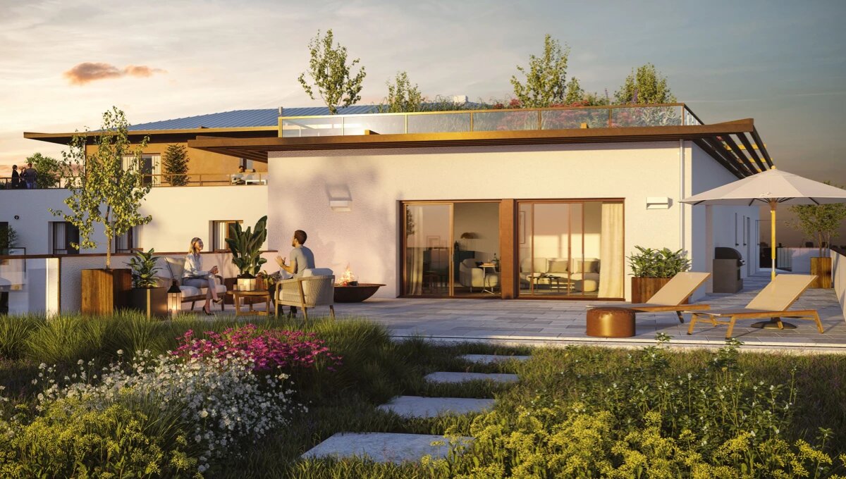 Chaque logement bénéficie d’un espace extérieur généreux : balcons, terrasses filantes ou jardins suspendus, offrant des pièces de vie en plein air, ombragées par des pergolas en débord de toit. En cœur d’îlot, un jardin paysager aux essences variées évolue au fil des saisons, réservé au seul plaisir des résidents 🌿.