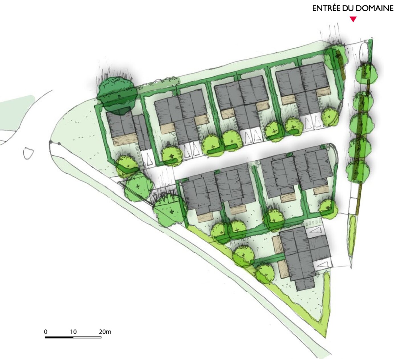 🌞 Pensée pour maximiser l’ensoleillement et préserver l’intimité, l’implantation des maisons valorise les vues sur les espaces verts. Ardoises naturelles, bardages bois, murets en pierre… l’architecture s’intègre harmonieusement dans son environnement, en revisitant l’esprit des maisons de pays.